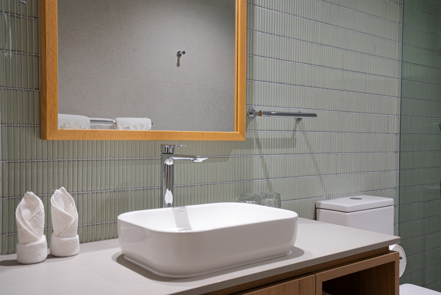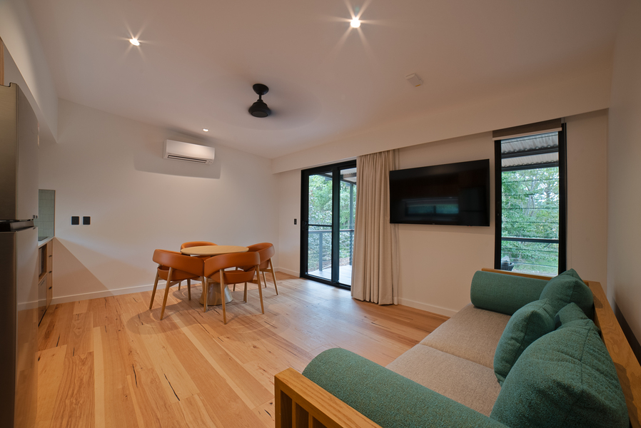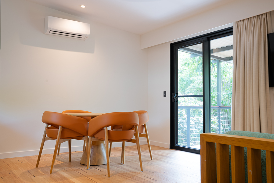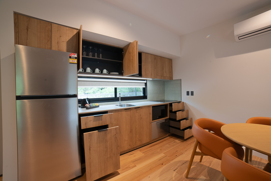 Unwind in style with a King bed, private balcony, kitchenette, 55″ Chromecast TV, and separate lounge & dining. Modern, elegant, and made to feel like home. Book your luxury escape now!