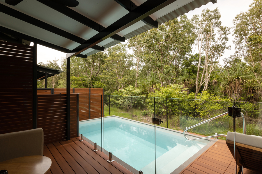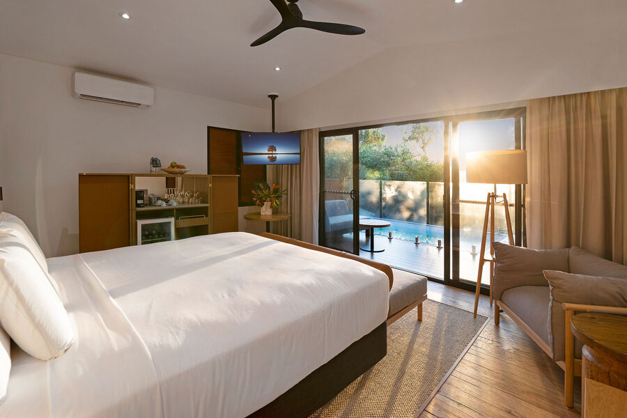 Unwind in our exclusive Tropical Pool Villa, featuring a lavish king-sized bed, a large LCD TV for your entertainment, and Indigenous-inspired decor that exudes tropical charm.